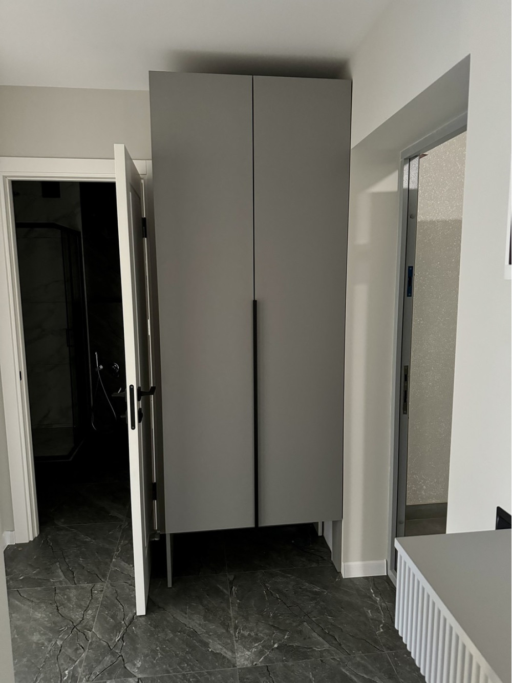 Проста та сучасна прихожа виготовлена із ЛДСП Egger та якісної фурнітури Blum. Акценту додають чорні ручки